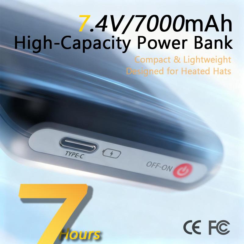 Power your heated hat with this compact 7.4V/7000mAh power bank, designed for long-lasting warmth. Provides up to 7 hours of heat, featuring a Type-C port for easy charging. Lightweight and portable, it's the perfect companion for outdoor activities in cold weather.