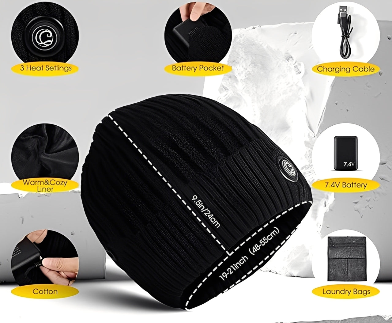 Stay warm with this soft, breathable heated beanie featuring 3 heat settings and a 7.4V rechargeable battery. Perfect for outdoor activities, it fits all head sizes (19-21 inches) and offers up to 8 hours of warmth.